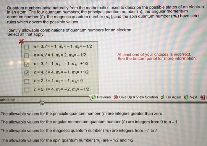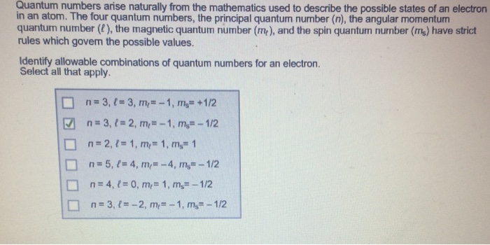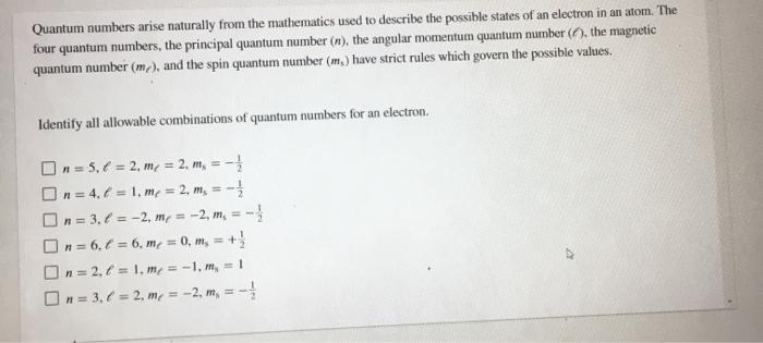 Quantum numbers arise naturally from the mathematics used to describe the possible states of an electron in an atom. Quantum numbers arise naturally from the mathematics used to describe the possible states of an electron in an atom. The four quantum numbers the principal quantum number n the angular momentum quantum number the magnetic quantum number me and the spin quantum number m have strict rules which govern the possible values Identify all allowable.